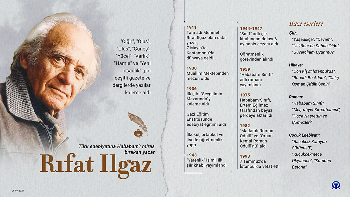 Rıfat Ilgaz, Cumhuriyet dönemi Türk edebiyatının toplumcu gerçekçi çizgisinde eserler veren şair, yazar ve eğitimcidir. Özellikle “Hababam Sınıfı” ile geniş kitlelerce tanınmıştır. Şiir, roman, hikâye, mizah ve anı türlerinde eserler vermiştir.