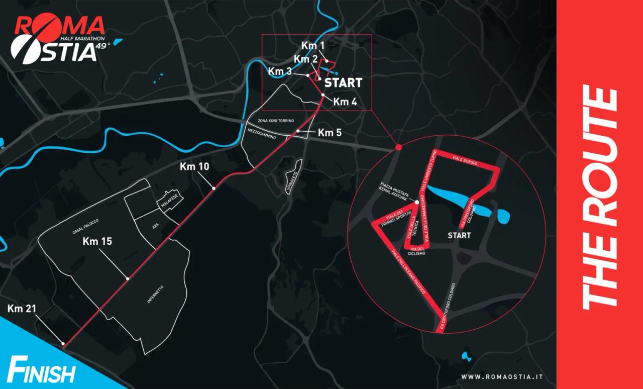 The course begins near Palalottomatica in Rome and follows Via Cristoforo Colombo, ending at Piazzale Cristoforo Colombo in Ostia. Approximately 17 kilometers of the course are run on a straight line. As of 2025, the course layout was updated by removing the previously challenging U-turn section and adding new streets in the EUR district. The added streets, such as Viale dell’Umanesimo, Via del Ciclismo, and Viale della Tecnica, are wide and flat. The total elevation gain is about 155 meters. Runners start from a slightly retracted starting point and complete a single-loop, fast course. A detailed map is available via the official link.
