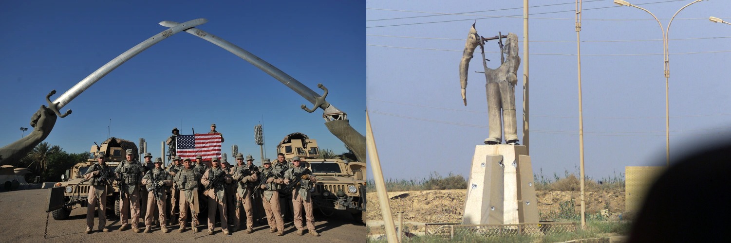 Bağdat'da Çapraz Kılıç Anıtı Önünde Duran Amerikan Askerleri (DVIDS) İşgal Sırasında Hasar Alan Saddam Heykeli (Picryl)