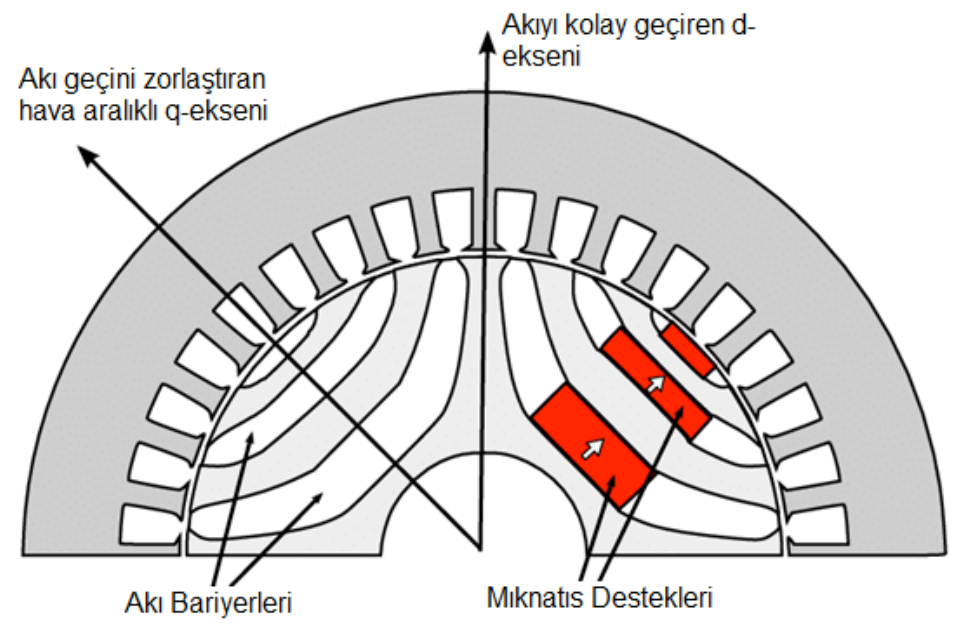 Rotorlarında, SynRM’leri diğer AC motorlardan farklı kılan, akı bariyerleri olarak isimlendirilen ve momentin oluşturulmasını sağlayan bir tasarım bulunmaktadır. Bu tasarıma göre rotor koordinat sistemindeki d-q eksenlerinin manyetik indüksiyon miktarlarının oranı olan çıkıklık oranı tanımlanır. Motor tarafından üretilen momenti maksimum yapmak için çıkıklık oranını artırmak gerekir ve bu nedenle SynRM’lerde rotor akı bariyer tasarımları gerçekleştirilir.