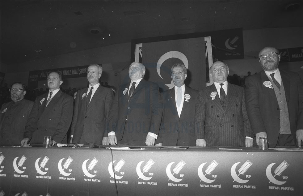 Şevket Kazan (sol 3), Dönemin Refah Partisi Genel Başkanı Necmettin Erbakan ile 21 Ocak 1990'da Milli Görüş'ün 20. yılı toplantısına katıldı (Selahattin Yılmaz - Anadolu Ajansı )