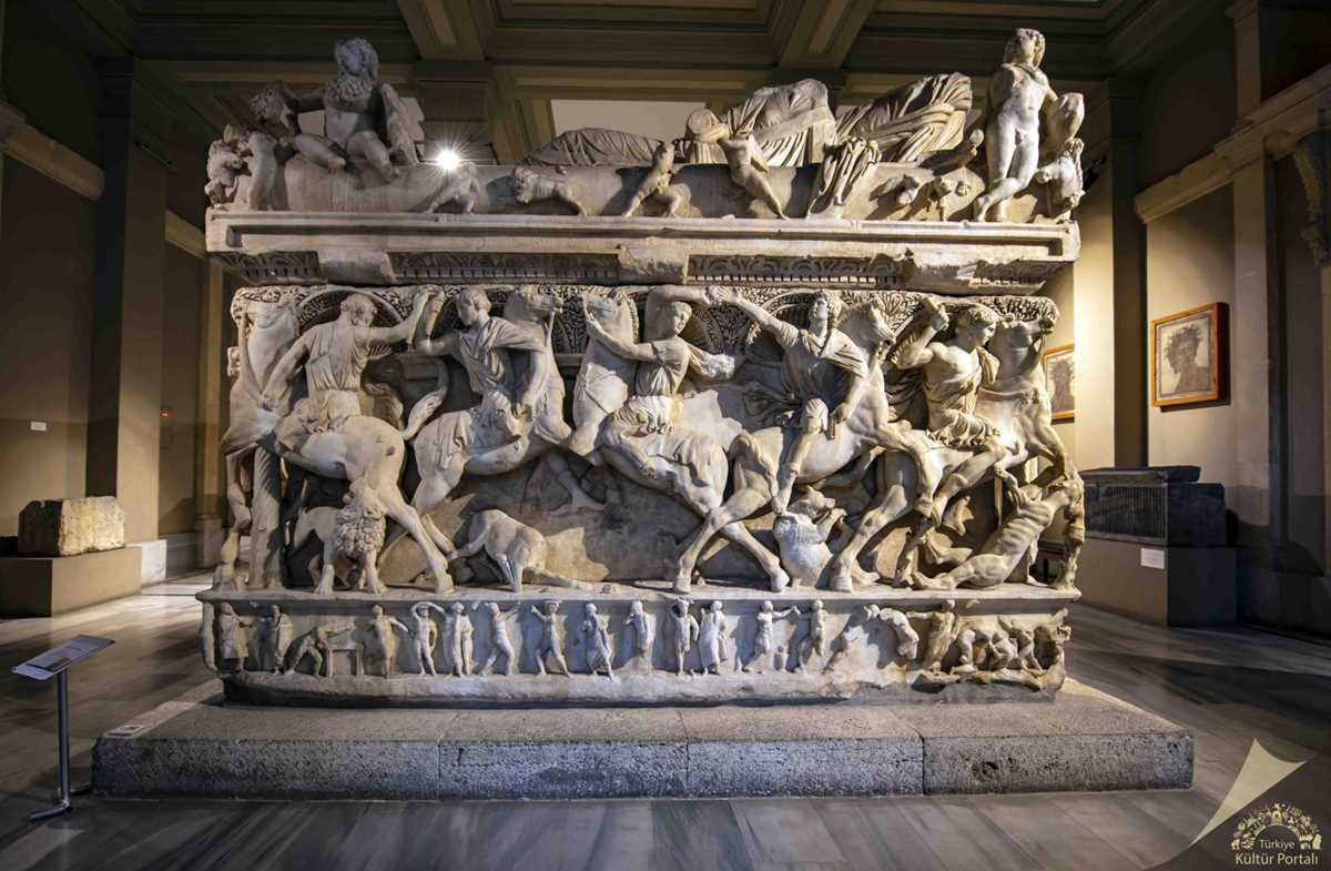 Tamamı beyaz mermerden yapılmış olan lahit yaklaşık 381 cm uzunluğunda, 200 cm genişliğinde ve 313 cm yüksekliğindedir; ağırlığı 30 tonun üzerindedir. Sanduka formundaki gövde, dört cephesi boyunca yivli sütunlarla kuşatılmıştır. Sütun aralıklarında, her biri bağımsız kompozisyonlar hâlinde düzenlenmiş yüksek kabartmalar yer alır. Figürler canlı duruşları, drapeli giysileri ve sahneler arasındaki hiyerarşiyle dikkat çeker.