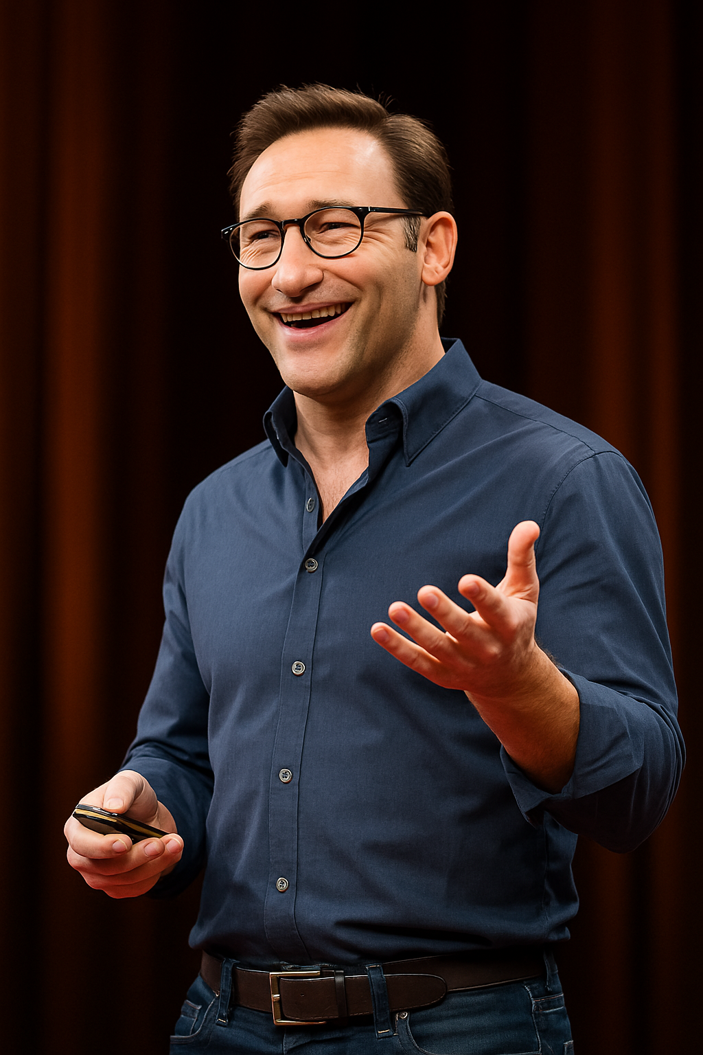 Simon Sinek'in sahnede konuşma yaptığı bir görüntü. Yapay zeka zeka ile tasarlanmıştır.