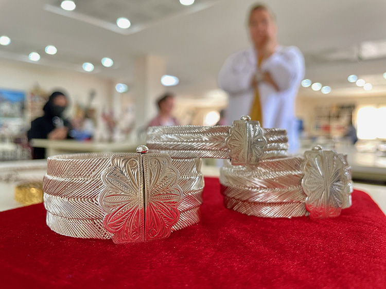 - Alınlık Takılması: Her iki ucu düz kesilen cebeye, ürünle aynı malzemeden yapılmış motifli plaka ve klips monte edilir. Kalem işçiliğiyle işlenen motifler genellikle bitkisel ya da geometrik şekillerdir. Klipsler, döküm yöntemiyle şekillendirilir.