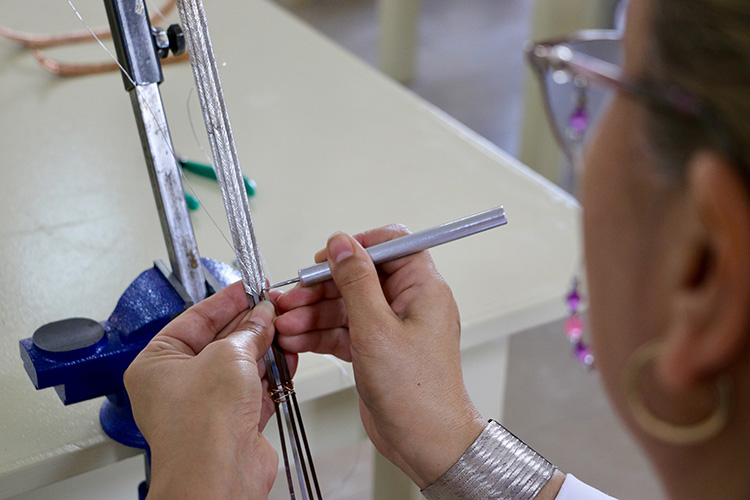 - Örme İşlemi: Yaklaşık 1 cm eninde dört bakır levhadan oluşan özel tezgâhta, 55 mikron kalınlığında ve 17–19 metre uzunluğundaki altın ya da gümüş tellerle örgü yapılır. Her tel parçası bir öncekine kaynakla bağlanır. Örgü tamamlandıktan sonra bakır levhadan balmumu ve ısı yoluyla ayrılır; orta göbek kısmına kabartma işlemi uygulanır.