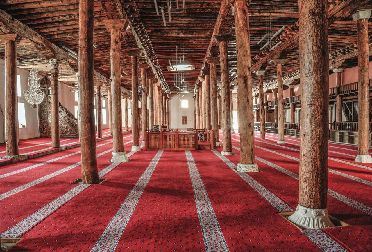 Although the interior of the mosque is designed with a simple architectural approach, the decorations on the columns enrich this simplicity. All the columns are adorned with elegant ornaments in the style of Central Asian tent architecture. The prayer hall has a rectangular plan oriented east-west, with the naves separated by beams connected to wooden columns. Circular panels placed between these beams are completed with wooden coverings on top. The columns opposite the minbar and mihrab are decorated with rich carvings and reliefs. Some columns near the mihrab feature brass diamond-shaped plates painted with green and black patterns, preserving their original features. While the columns near the market exit are simpler, some have maintained their original structures over time.