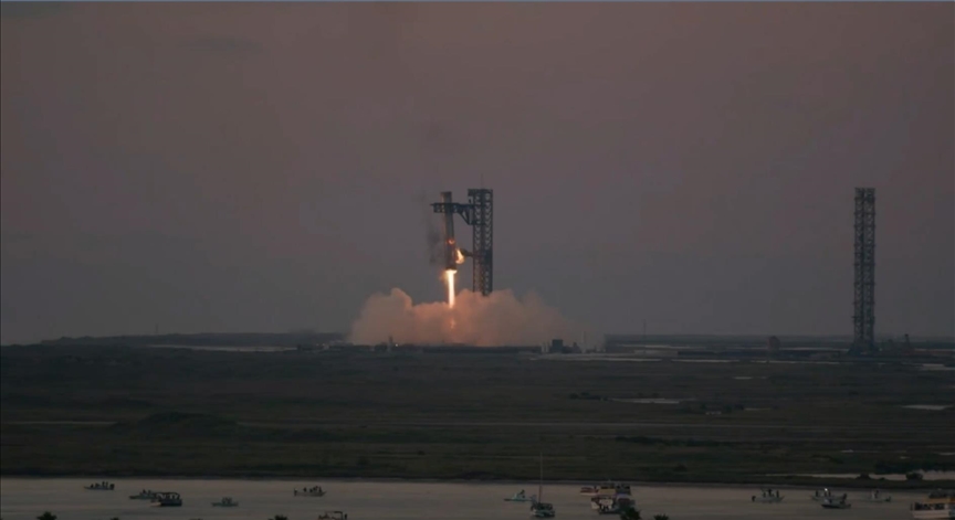 - Güçlendiricinin Dönüşü: Görevini tamamlayan Super Heavy, fırlatma rampasına geri dönmektedir. Atmosfere giriş sırasında 33 motorunu kullanarak hızını düşürmekte ve fırlatma kulesine yaklaştığında yavaşlayarak mekanik kollar tarafından havada yakalanmaktadır.