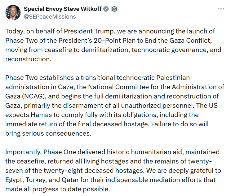 Witkoff, 14 Ocak 2026 tarihinde Başkan Donald Trump adına yürüttüğü Gazze diplomasisinde, 20 maddelik barış planının ikinci aşamasını başlattığını duyurdu. Bu aşamanın temel yapı taşı, Gazze Şeridi’nin idaresini üstlenecek olan ve Dr. Ali Abdel Hamid Shaath başkanlığındaki Filistinli Teknokrat Komite (Gazze Yönetimi Ulusal Komitesi) olarak belirlendi.【19】