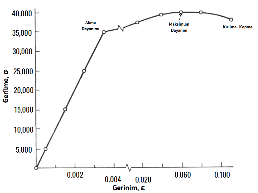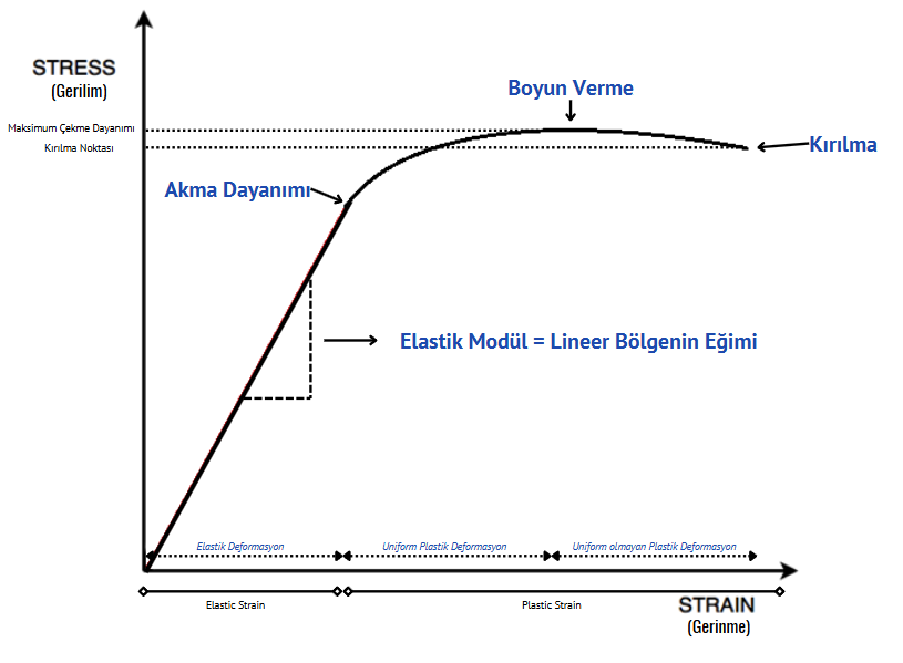 Burada E, malzemenin elastik modülüdür. Elastik bölgenin ötesinde malzeme plastik deformasyona uğrar ve gerilme-gerinim eğrisi doğrusal olmayan bir davranış sergiler. Bu noktadan itibaren meydana gelen deformasyon kalıcıdır. Akma dayanımı (yield strength), malzemenin plastik akıya uğradığı minimum gerilme değeridir. Nihai dayanım noktası (UTS - Ultimate Tensile Strength), malzemenin taşıyabileceği maksimum gerilmeyi gösterir. Kopma noktası ise malzemenin nihai olarak kırıldığı gerinim seviyesidir.