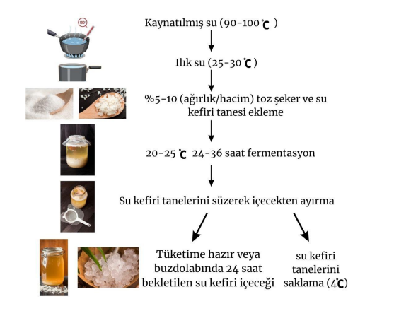 Su kefiri yapımında öncelikle su ve şeker, uygun sıcaklıkta karıştırılır. Şeker, mayalar tarafından glukoz ve fruktoza parçalanır. Su kefiri taneleri bu karışıma eklenir ve konsorsiyumda yer alan mikroorganizmalar, simbiyotik ilişkileri sayesinde çoğalır ve metabolik ürünler üretir. Fermantasyon sırasında kuru meyveler, mikroorganizmalar için vitamin, mineral ve azot kaynağı olarak kullanılır ve metabolitlerle etkileşime girer. Fermantasyon genellikle ilk 24 saatte homopolisakkarit üretimiyle başlar, 72. saatte gliserol, asetik asit ve mannitol oluşur, 8 gün sonunda ise laktik asit ve etanol birikimi gözlemlenir. Fermentasyon sıcaklığı 25–32 °C arasında tutulur. Fermantasyon tamamlandıktan sonra taneler süzülür ve sıvı tüketilir, taneler temizlenip tekrar kullanılabilir. Fermantasyon koşulları, tanelerin canlılığını, metabolit üretimini ve mikroorganizma dağılımını doğrudan etkiler; pH değeri 3,5’in altına düştüğünde patojenlerin gelişimi engellenir.
