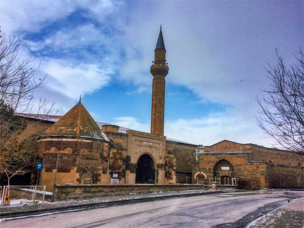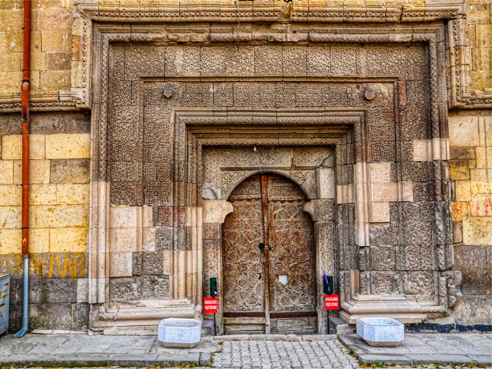 Kuzey cephenin doğu köşesinde, dıştan merdivenle ulaşılan fevkani bir giriş olan “Bey Kapısı” bulunmaktadır. Doğu cephesindeki taç kapı, eyvan biçimindedir ve iki yanına simetrik olarak yerleştirilmiş minarelerle sınırlanmıştır. Bu cepheye yerleştirilen taç kapının konumu, arazinin topografik yapısıyla ilgilidir. Çifte minareli taç kapı, Türk mimarisinde özel ve seçkin bir yere sahiptir.