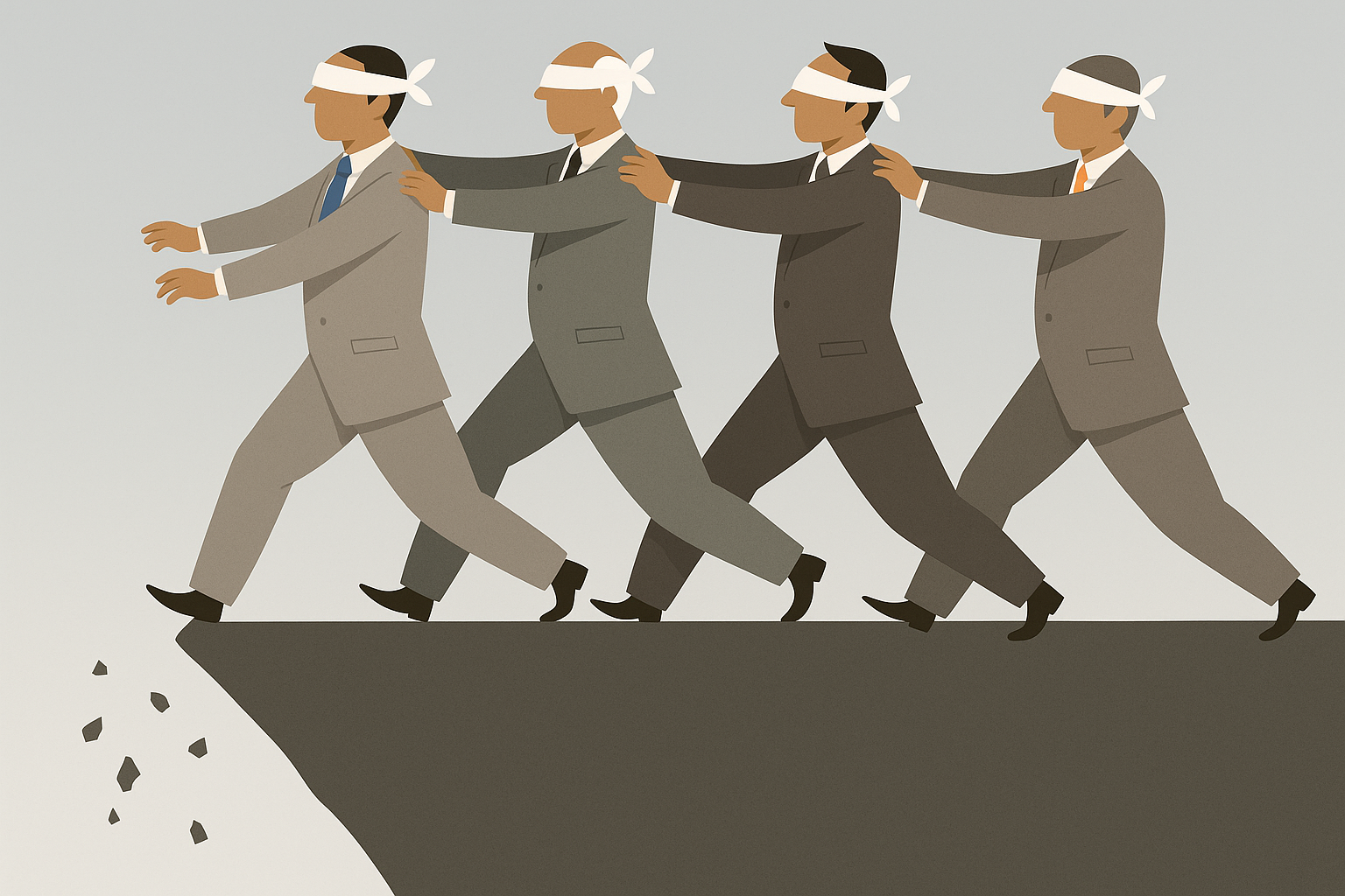Körü Körüne İtaat ve Sürü Psikolojisini Simgeleyen, Uçuruma Doğru Yürüyen Gözleri Bağlı Sdamlar (Yapay Zeka İle Oluşturulmuştur.)