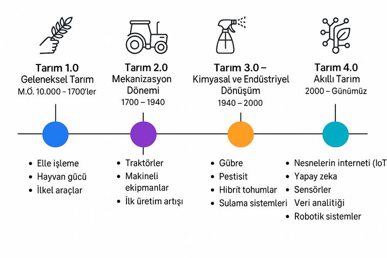 Dünya nüfusundaki hızlı artış ve buna bağlı olarak artan gıda talebini karşılamak amacıyla, endüstriyel teknolojiler tarım sektörüne uyarlanmıştır. Tarım 4.0【1】 , Sanayi 4.0【2】 kavramının tarımsal üretim alanındaki yansıması olup, dijital teknolojilerin kullanılmasıyla tarımsal faaliyetlerin daha verimli, sürdürülebilir ve akıllı hale getirilmesini amaçlayan bir dönüşüm sürecidir. Bu kapsamda, sensörler, büyük veri analitiği, yapay zeka, robotik sistemler ve uzaktan algılama teknolojileri gibi yenilikçi araçlar kullanılarak tarımda verimlilik ve kaynak kullanım etkinliği artırılmaktadır.