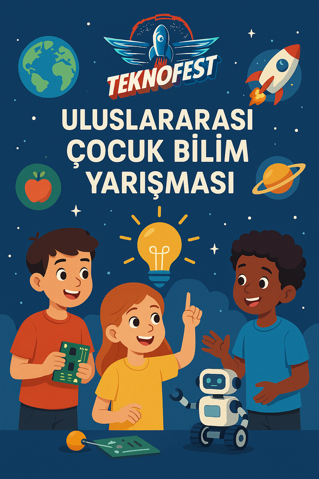 Üç çocuğun neşeyle robotik projeler üzerinde çalıştığı, TEKNOFEST logolu ve bilim temalı renkli bir yarışma posteri (yapay zeka ile oluşturuldu).