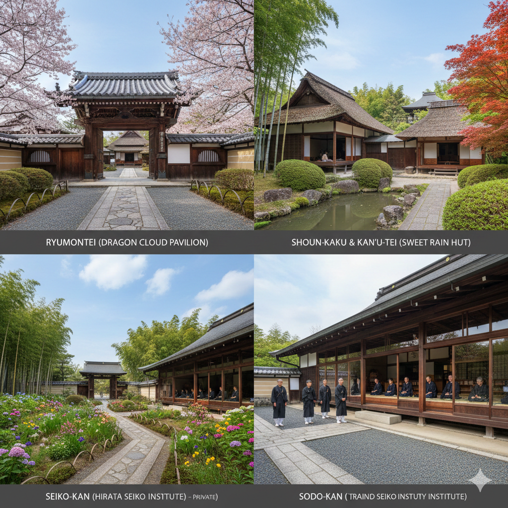 Ryumontei, Yu'un-an, Shoun-kaku ve Sodo Yapılarını Tasvir Eden Bir Görsel (Yapay Zeka ile Oluşturulmuştur.)