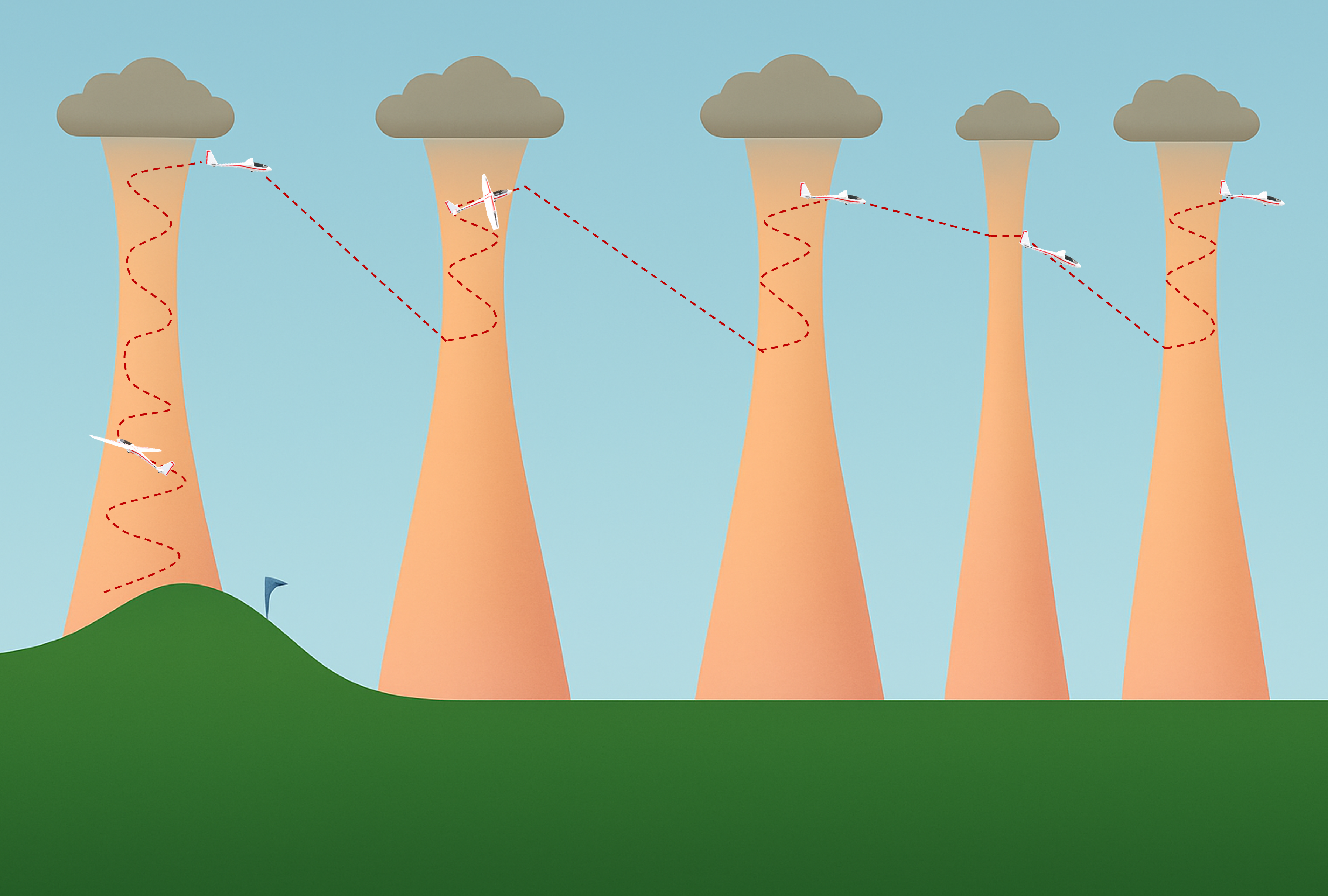 şeklinde modellenebilir. Burada, termal çekirdeğindeki maksimum dikey hızı (m/s), , termalin çekirdek koordinatlarını ve ise termalin karakteristik yarıçapını temsil etmektedir . Bu model, kaldırıcı etkinin termalin merkezinde en yüksek olup kenarlara doğru üssel biçimde azaldığını yansıtır. Gerçek atmosferde termal yapısı irtifaya göre değişebilir ve rüzgâr/ türbülans etkileriyle çekirdek konumu dalgalanabilir; ancak yukarıdaki idealize formüller, hem pilotların uçuş planlamasında hem de otonom sistemlerin kontrol algoritmalarında önemli bir yol gösterici rolü oynamaktadır. Örneğin, MacCready’nin ünlü hız seçimi teorisi, bir planör pilotuna bir sonraki termikte beklenen tırmanış oranına göre en uygun seyir hızını belirleme imkânı verir. Bu sayede planör, termaller arası geçişi toplam uçuş süresini minimize edecek şekilde gerçekleştirebilir. Benzer prensiplerin yaban kuşları tarafından içgüdüsel olarak uygulandığı, kuş ve planör verilerinin karşılaştırılmasıyla ortaya konmuştur.
