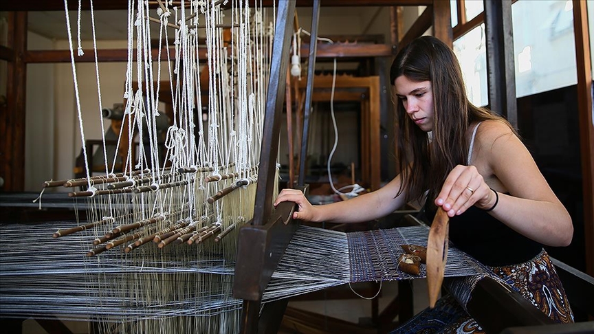Yurtdışından Gelen Kyra Zapf, Tire Beledi Dokumacılığını Öğrenirken (Anadolu Ajansı)