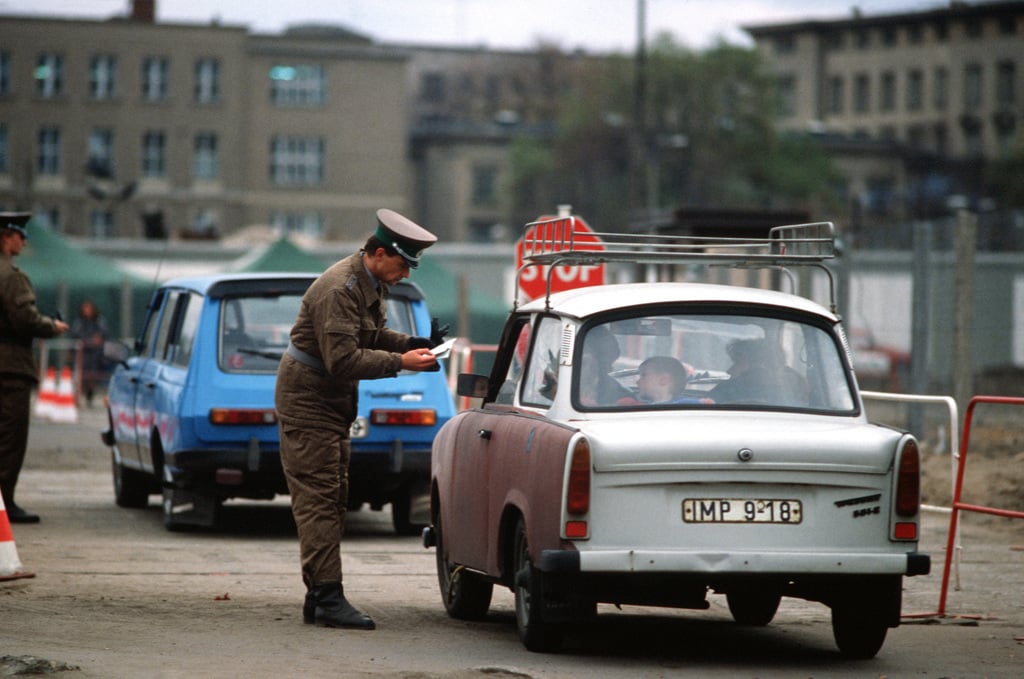 Bir Doğu Alman Polisi, Potsdamer Platz'daki Berlin Duvarı'nda Trabant'ı Denetliyor. (National Archives (NARA))