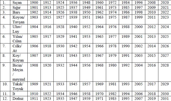 12 Hayvanlı Türk Takvimi ve günümüzdeki takvime göre yılların karşılıkları şöyledir: