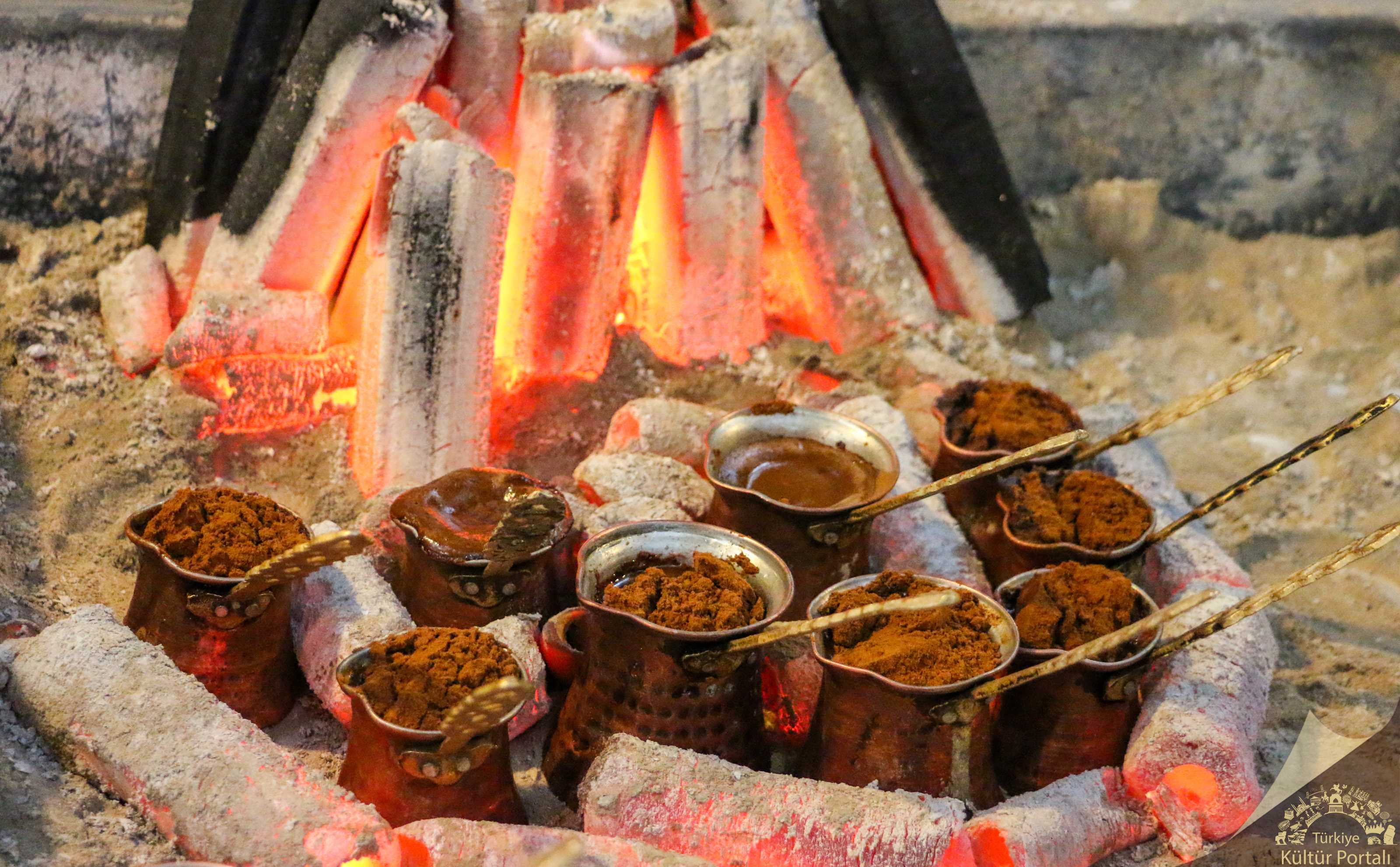Türk kahvesi kültürü, el sanatlarıyla birlikte gelişen bir mirastır. Kahve hazırlama ve sunumunda kullanılan cezve, fincan, tepsi ve kahve değirmeni gibi araçlar hem işlevsel hem estetik nitelikler taşır. Bu eşyalar, bakır, pirinç, gümüş ve porselen gibi malzemelerle üretilmiş; dönemin süsleme anlayışını yansıtan motiflerle bezenmiştir.