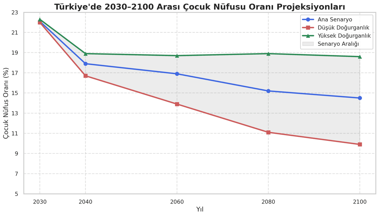 TÜİK’in ana senaryosuna göre çocuk nüfus oranı 2030 yılında yüzde 22,1’e, 2100 yılında ise yüzde 14,5’e düşecektir. Düşük doğurganlık senaryosuna göre bu oran 2100'de yüzde 9,9’a kadar gerileyebilirken, yüksek doğurganlık senaryosunda 2100 yılı tahmini yüzde 18,6’dır. Avrupa Birliği ülkeleriyle kıyaslandığında Türkiye'nin yüzde 25,5’lik çocuk oranı, AB ortalaması olan yüzde 17,8’in üzerindedir.