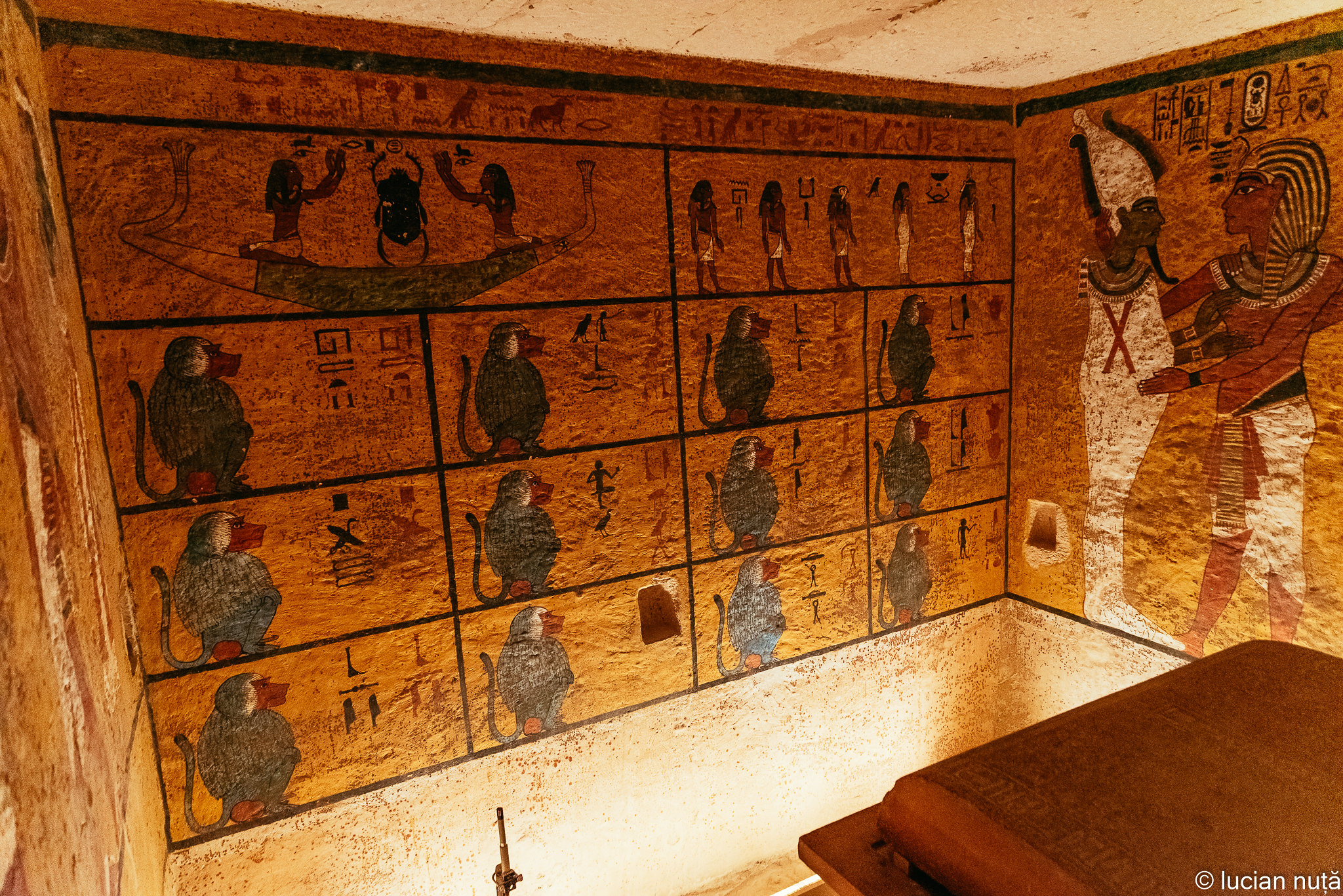 Gömüt odasının batı duvarında, kralın ölümden sonra geçmesi gereken gece saatlerini temsil eden 12 babun figürü yer alır. Bu figürler, ölüler dünyasındaki geçişin saat dilimlerini simgeler. Doğu duvarında ise yüksek rütbeli Mısırlı görevlilerin Tutankhamun’un mumyasını mezara taşıdıkları sahne görülür.