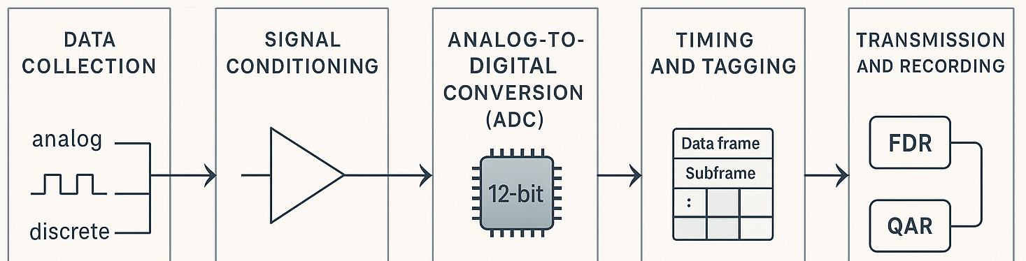 Uçuş verileri; sensörler, göstergeler, röleler ve sistem kontrol modülleri gibi çok sayıda kaynaktan FDAU’ya (Flight Data Acquisition Unit) ulaşır. Veriler dört ana kategoride sınıflandırılır: ayrık (discrete), analog, senkronizasyon (synchro) ve dijital (ARINC 429 gibi sayısal veri hatları). Bu veriler, önceden belirlenmiş bir örnekleme sıklığıyla toplanır, dijitalleştirilir ve Harvard iki fazlı formatta kodlanarak FDR’ye aktarılır. FDAU’nun görevi yalnızca veriyi toplamak değil, aynı zamanda bu verileri zaman damgalarıyla senkronize etmek, hata kontrolü yapmak ve kayıt öncesinde doğrulama işlemlerini gerçekleştirmektir.