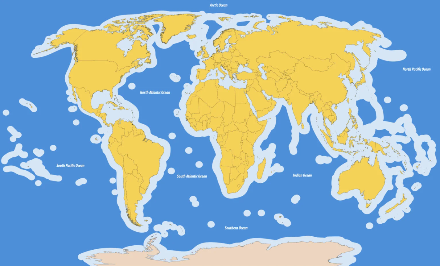 Aşağıdaki görselde mavi ile belirtilen bölgeler uluslararası suları göstermekteyken, beyaz renkli alanlar ilgili ülkelerin resmi karasularını göstermektedir. Sarı ve pembe alanlar ise dünya haritasındaki kıtaları/ülkeleri temsil etmektedir.