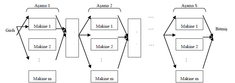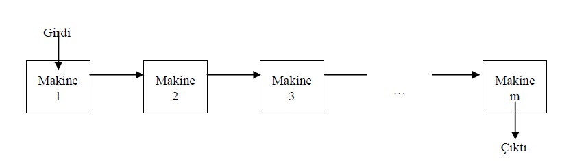 Akış tipi atölye düzenleri, makinelerin sıralı bir şekilde dizildiği ve işlerin belirli bir rota boyunca işlendiği üretim ortamlarını ifade eder. İşler, ilk makinede başlar, ara makinelerden geçer ve son makinede tamamlanır. Bu düzen genellikle akış tipi atölye olarak adlandırılsa da, gerçek üretim sistemleri genellikle daha karmaşık yapılara sahiptir. Akış tipi atölye çizelgelemesi, makinelerden belirli bir sıra ile geçmesi gereken işlere yönelik optimal bir çizelge oluşturmayı içerir. İşler, her makinede farklı işlem sürelerine sahip olabilir. Bu problem, iki temel bileşenden oluşur: m adet makine ve her biri aynı sırayla işlenecek ancak farklı işlem sürelerine sahip n adet iş.