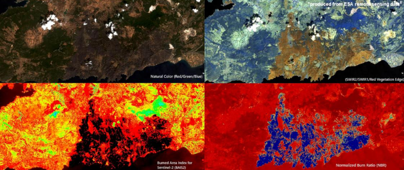 - Sentinel-2: 10-20 metre çözünürlük ile bitki örtüsünün yangından önce ve sonra nasıl değiştiğini analiz etmektedir.