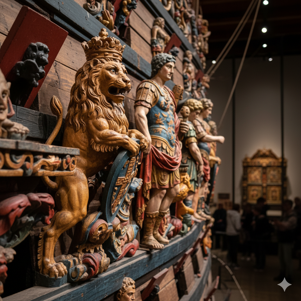 Gemiyi Süsleyen Ahşap Oymaların, Özellikle Kıç Tarafındaki Detayların Yakından Görünümü (Yapay Zeka İle Oluşturulmuştur)