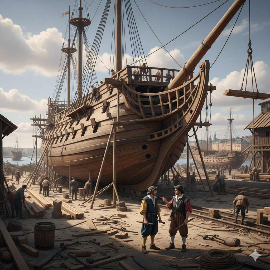 Stockholm Tersanesinde, 1620'Lerde Vasa'nın İskele Üzerinde İnşası (Yapay Zeka İle Oluşturulmuştur)