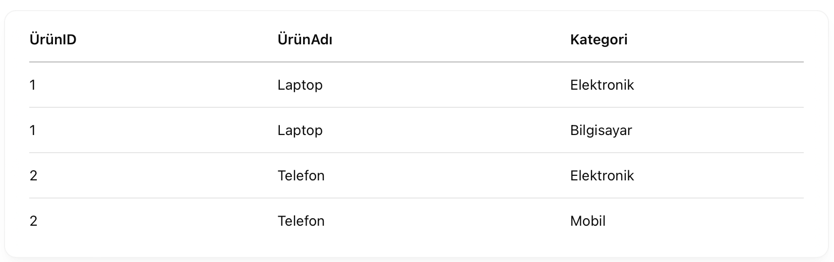 Bu tablo 1NF'ye uygun değildir çünkü "Kategoriler" sütunu birden fazla değeri içeriyor. 1NF'ye getirebilmek için her kategori ayrı bir satıra yerleştirilmelidir, tablonun düzeltilmiş hali şu şekildedir: