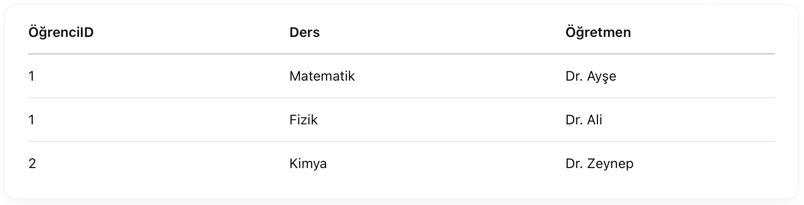 Yukarıdaki tabloda "Öğretmen" sütunu, "Ders" sütununa bağımlıdır ancak "ÖğrenciID" sütununa bağımlı değildir. Bu durumu 2NF'ye getirebilmek için yeni bir tablo oluşturulmalıdır.