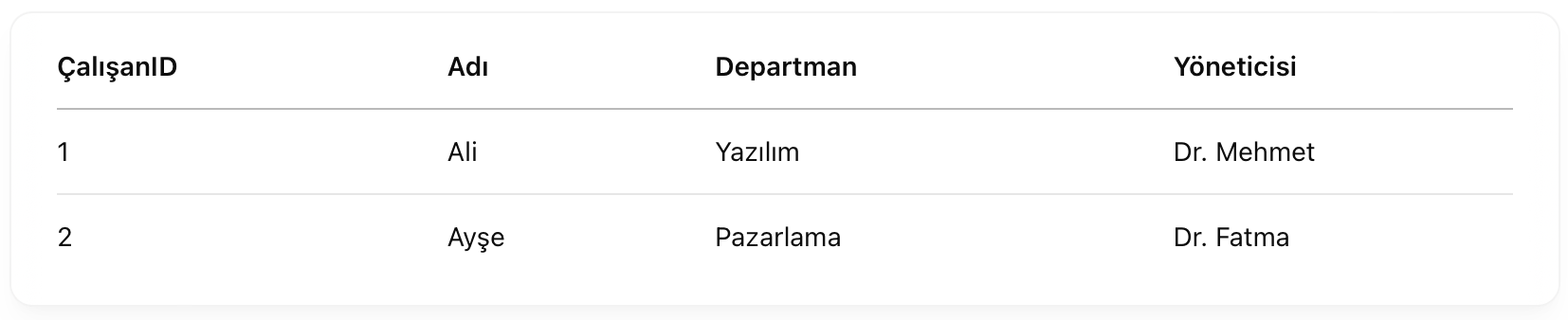 Bu tabloda, "Yöneticisi" sütunu sadece "Departman" sütununa bağlıdır ve dolaylı olarak "ÇalışanID"' sütununa bağımlıdır. 3NF'yi sağlamak için departman bilgisi ayrı bir tabloda yer almalıdır.