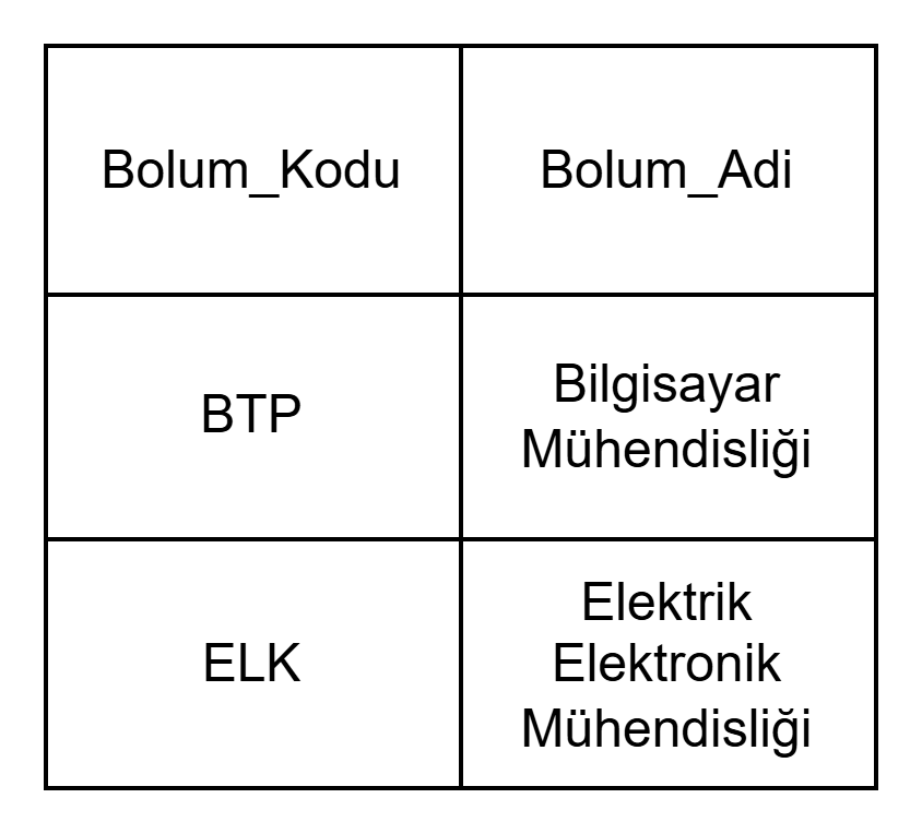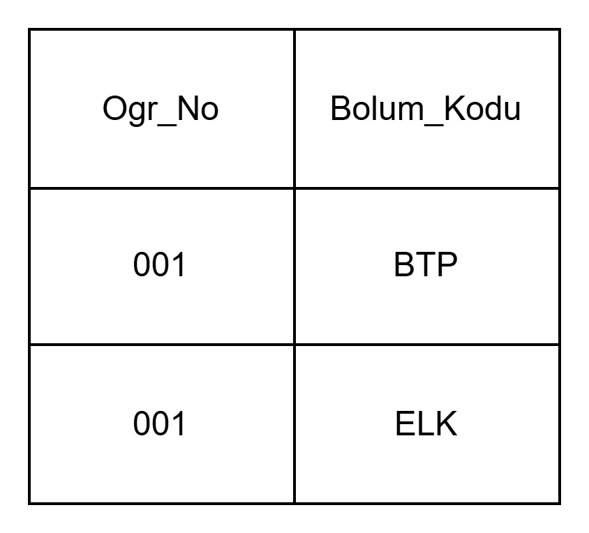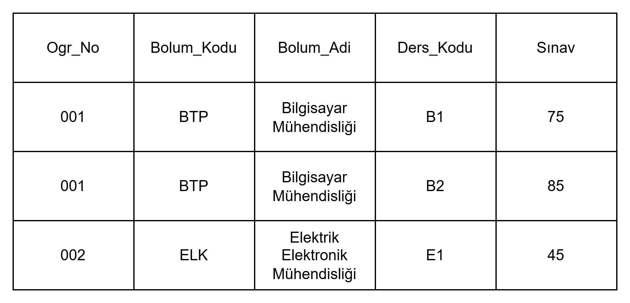 Bu tabloda "Bolum_adi" sütunu, "Bolum_kodu"na bağlıdır. Dolayısıyla "Bolum_adi" farklı bir tabloya taşınmalıdır: