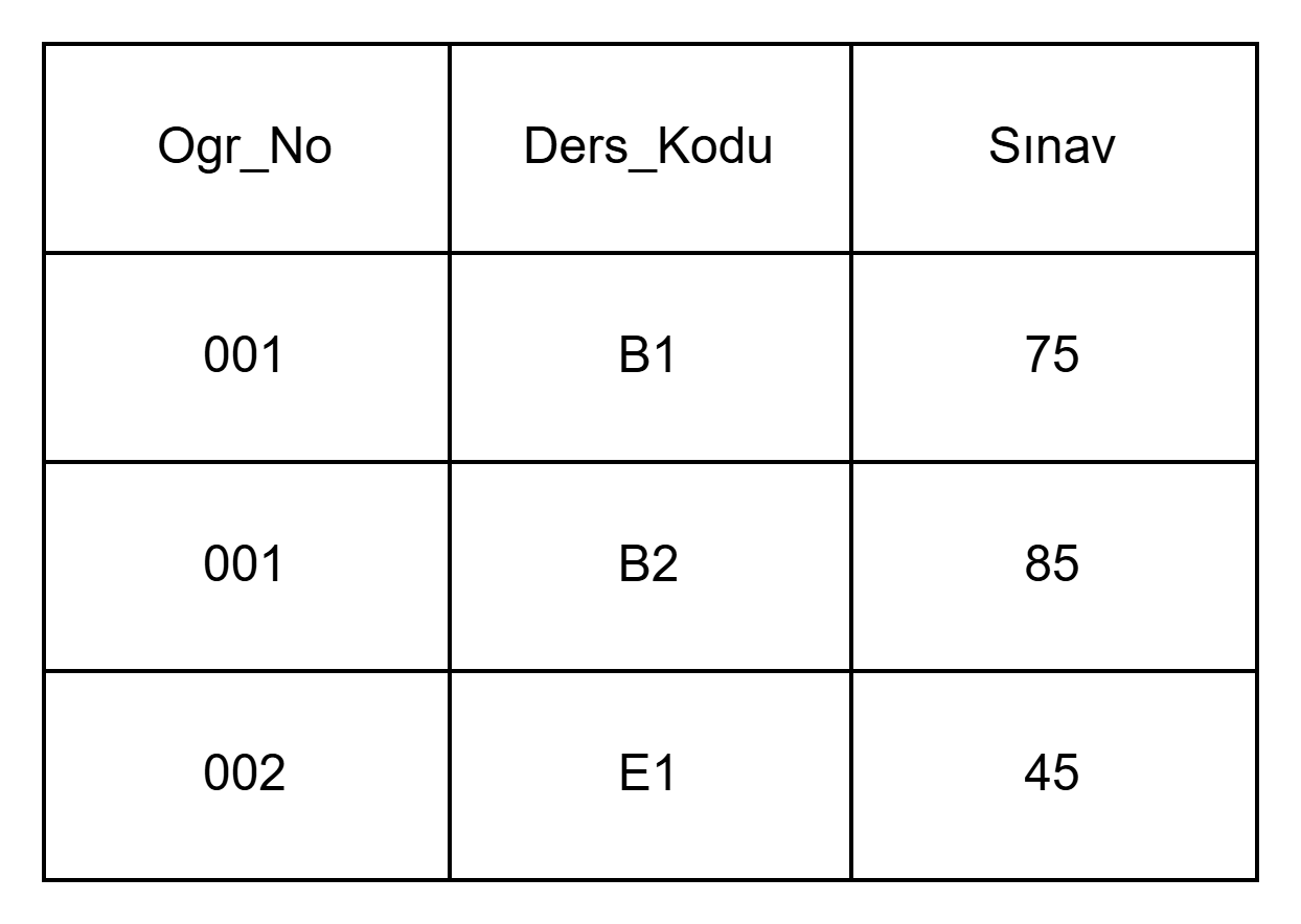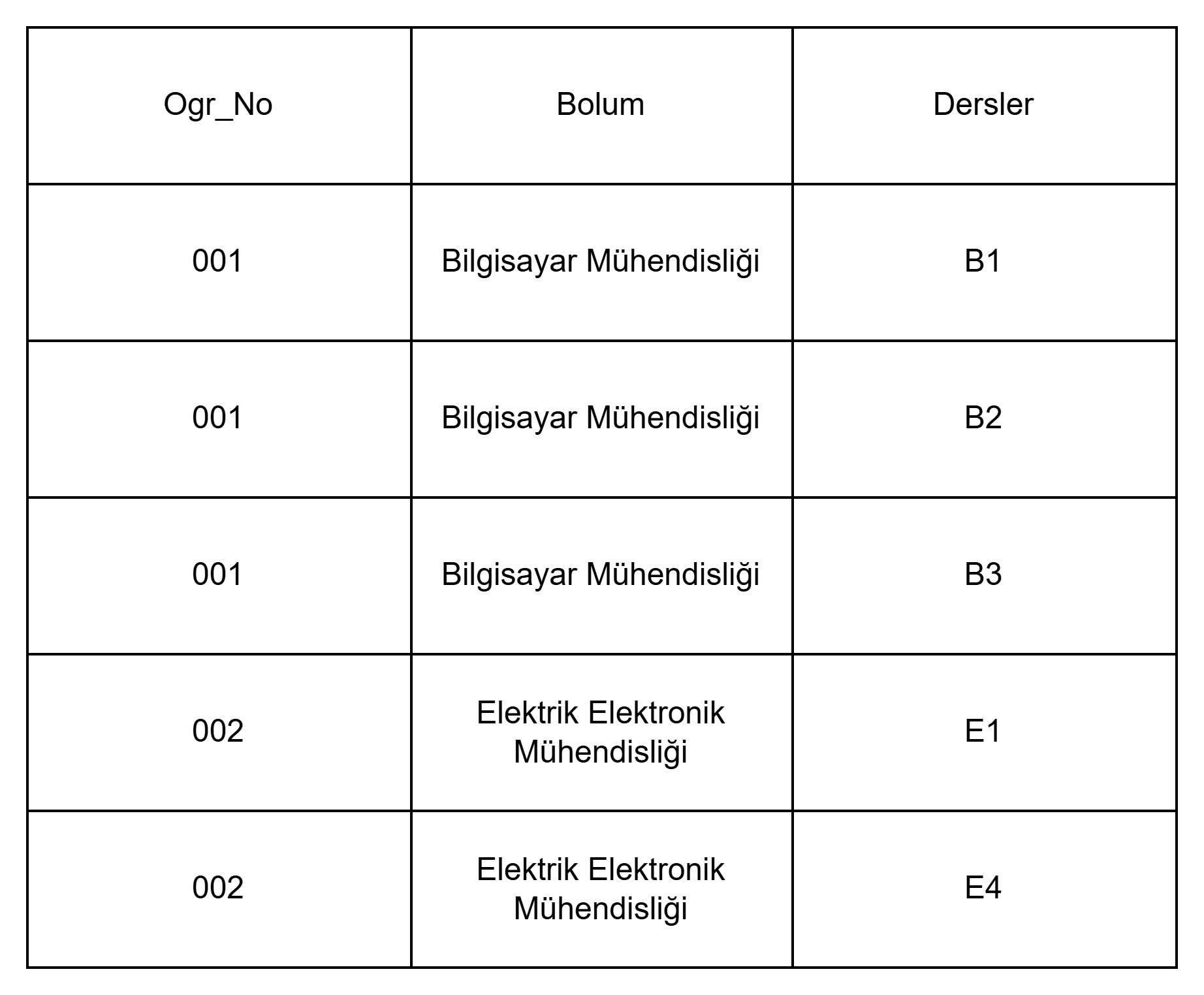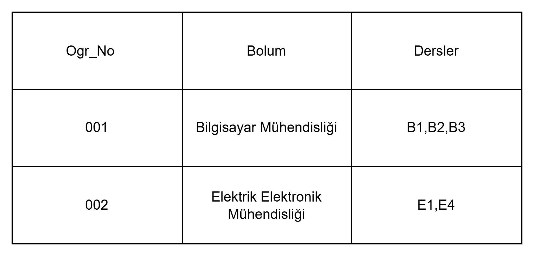 🔹 Örnek: Aşağıdaki öğrenci tablosu 1NF’ye uygun değildir çünkü "Dersler" sütununda birden fazla veri tutulmaktadır: