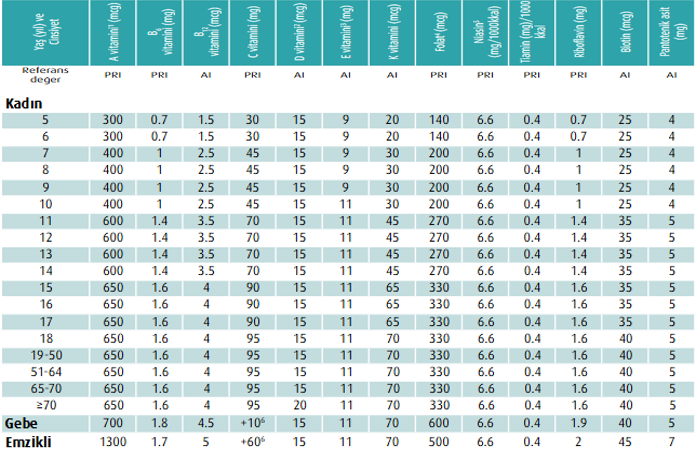 Kadın, Gebe ve Emzikliler İçin Önerilen Günlük Yeterli Vitamin Alım Değerleri (TÜBER, 2022)【3】