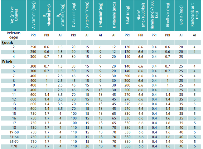 Çocuk ve Erkek İçin Önerilen Günlük Yeterli Vitamin Alım Değerleri (TÜBER, 2022)【2】
