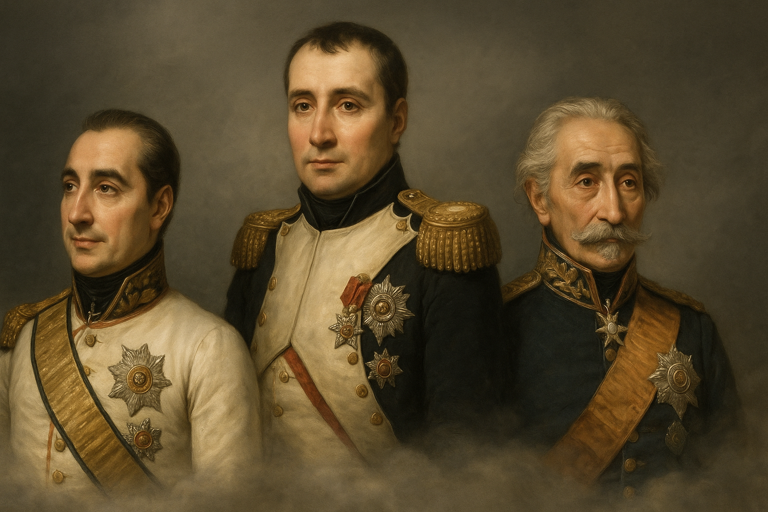 Üç Komutan: Wellington Dükü Arthur Wellesley- Napolyon Bonapart - Prens Blücher (Yapay zeka ile oluşturulmuştur.)