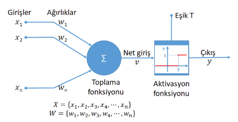 TLU nöron modelinde; n adet giriş değeri{x1,x2,x3,...,xn}, n adet ağırlık değeri {w1,w2,w3,...,wn}, 1 adet eşik değeri (T) ve 1 adet çıkış değeri (y) yer almaktadır.