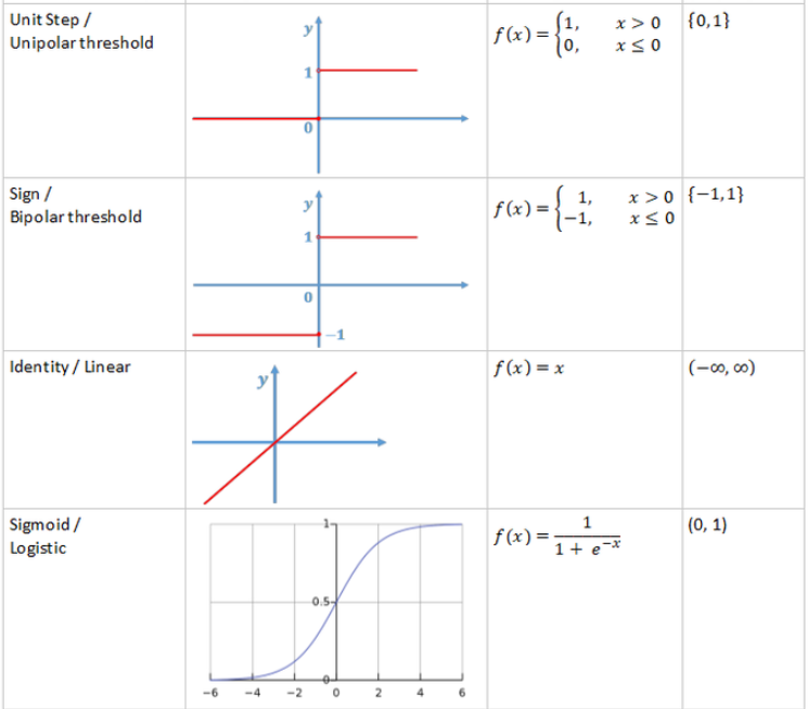 Aktivasyon fonksiyonu, hücreye gelen net girdiyi işleyerek hücrenin bu girdiye karşılık üreteceği çıktıyı belirler. Toplama fonksiyonunda olduğu gibi yapay sinir ağındaki tüm hücrelerin aynı aktivasyon fonksiyonunu kullanması gerekli değildir. Aktivasyon fonksiyonu örnekleri;
