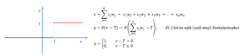 Aşağıda TLU tipindeki yapay sinir hücresinin (Perceptron - Algılayıcı) çıkış fonksiyonunun formülü gösterilmektedir.