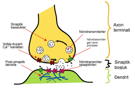 Bir sinir hücresinden diğer sinir hücresinin sinir hücresine sinaps üzerinden işaretlerin/sinyallerin taşınmasında neurotransmitter isimli özel verici kimyasal maddelerle sağlanır. Alınan kimyasal madde aracılığıyla alınan işaret hücrenin içindeki elektrik potansiyel değerine (eşik) ulaşırsa akson içine bir işaret gönderir. Buna hücrenin uyarılması denir.