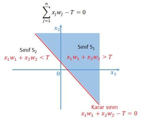 v = 0 şeklindeki doğrusal fonksiyon n-boyutlu giriş (özellik) uzayını ikiye ayıran karar sınırını (decision boundary / hyperplane) tanımlar. Aşağıda iki boyutlu (2 girişli), 2 sınıflı örüntü sınıflandırma problemine ait doğrunun geometrik gösterimi yer alıyor.