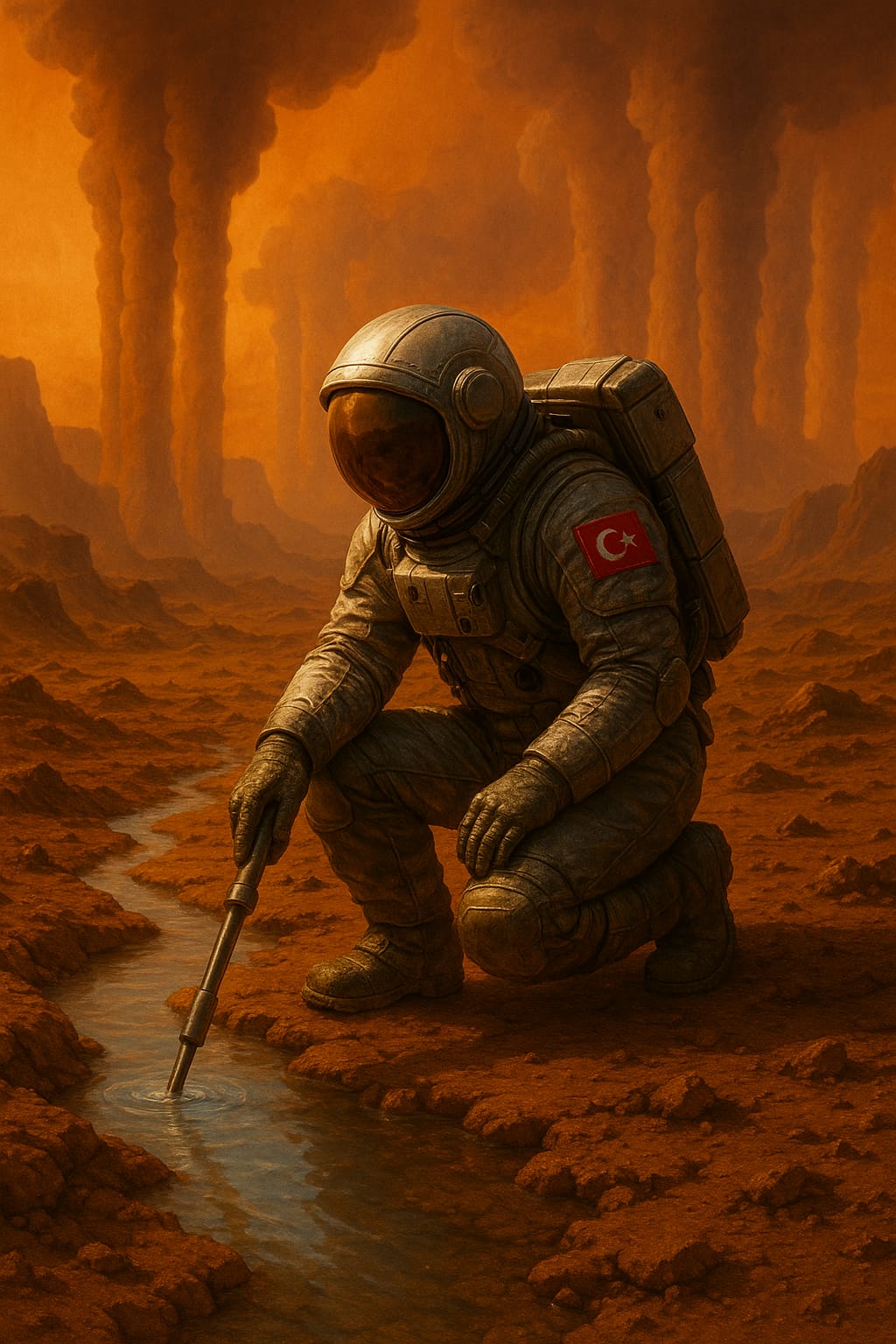 Mars'ta Su Ölçümü Yapan Bir Türk Astronot (Yapay Zeka İle Oluşturulmuştur.)