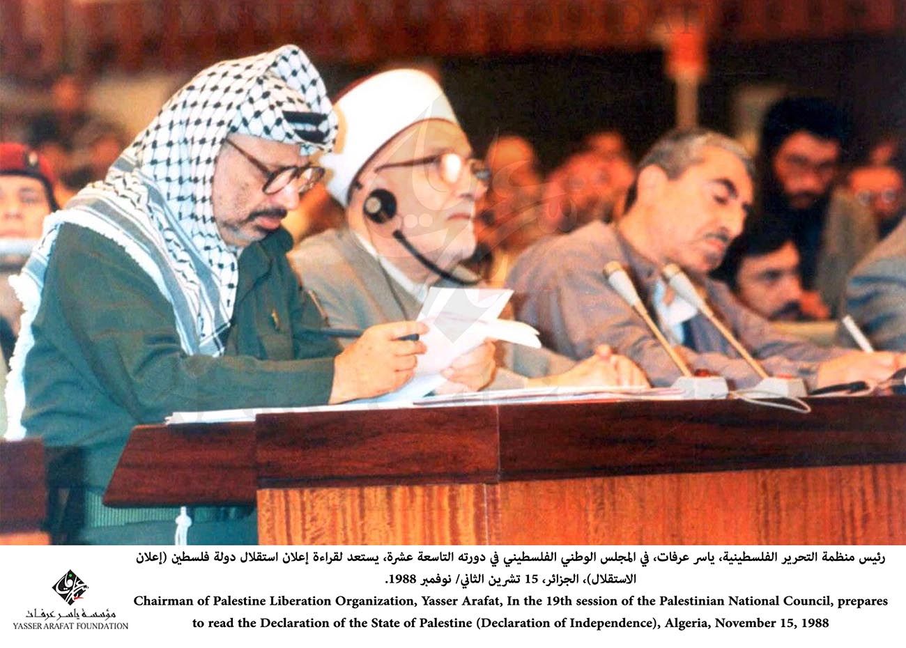 15 Kasım 1988 tarihinde, Cezayir’in başkenti Cezayir’de toplanan Filistin Ulusal Konseyi (FUK), Filistin Devleti’nin kurulduğunu ilan etmiştir. Bağımsızlık Bildirgesi, FKÖ Yürütme Komitesi Başkanı Yaser Arafat tarafından okunmuştur. Bildirgede, Filistin halkının doğal, tarihî ve yasal haklarına dayanılarak bağımsız devletin kurulduğu ifade edilmiştir. Metinde “Doğu Kudüs (El-Kuds eş-Şerif)” Filistin’in başkenti olarak belirtilmiş, Filistin’in sınırları açık biçimde tanımlanmamıştır. Bildirge, uluslararası hukuka ve Birleşmiş Milletler kararlarına atıfta bulunarak devletin meşruiyetini vurgulamıştır.