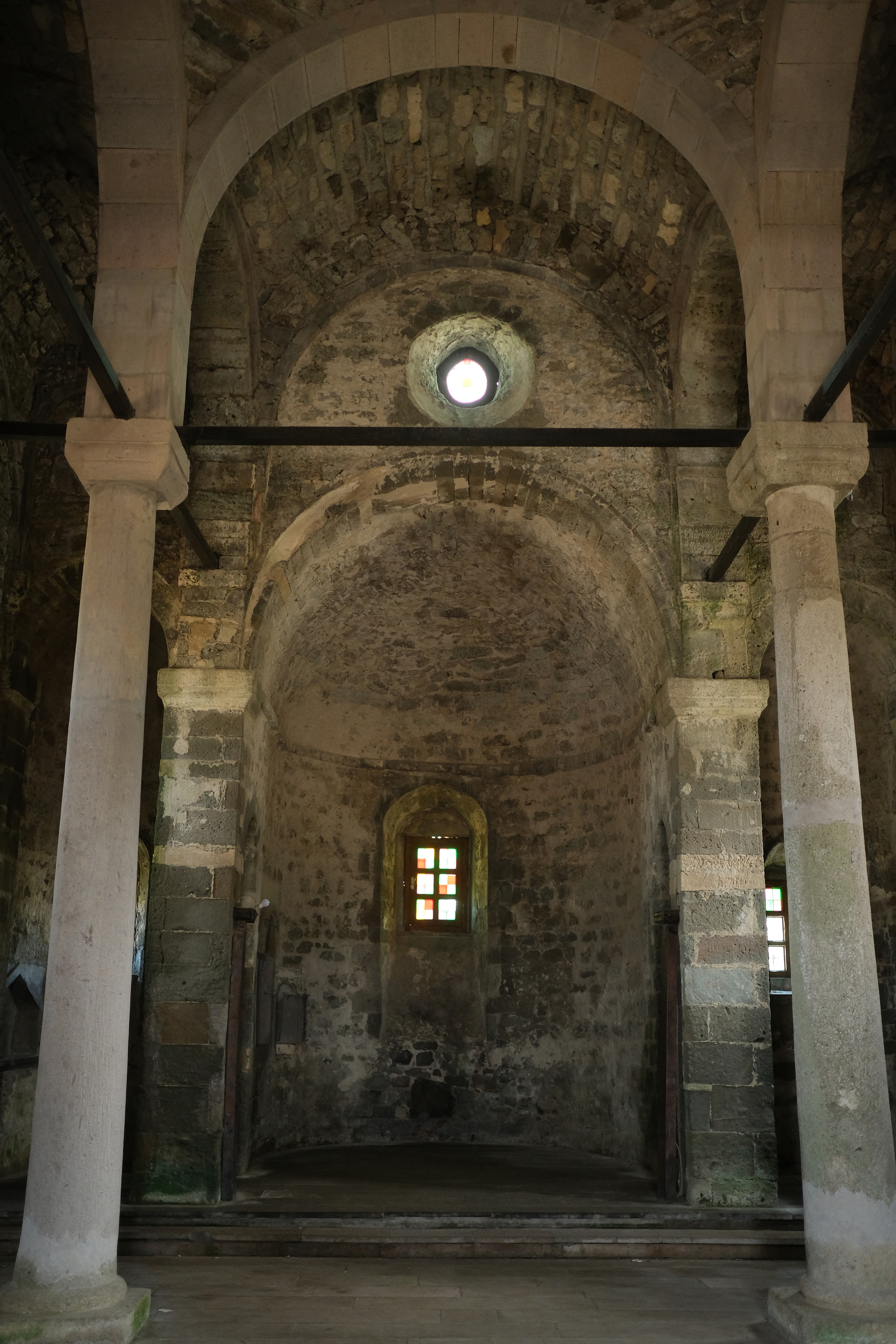 Doğuda, içten yarım daire şeklinde sonlanan apsislerden ana apsisin kuzey duvarında farklı ebatlarda, yuvarlak kemerli iki adet niş (duvar hücresi) yer alır. Kuzeydeki yan apsisin yine kuzey duvarında ise üçgen alınlıklı bir niş bulunur. Cephelerde dikdörtgen formlu olan pencereler, iç mekana doğru genişleyerek yuvarlak kemerlerle açılmaktadırlar. Apsislerin önünde yer alan bema bölümü (kutsal alan), naos zemininden iki basamakla yükseltilerek vurgulanmıştır. Ana apsisi yan apsislerden ayıran payelerin gerisinde, yan apsislere geçişi sağlayan kemerli birer açıklık da mevcuttur.