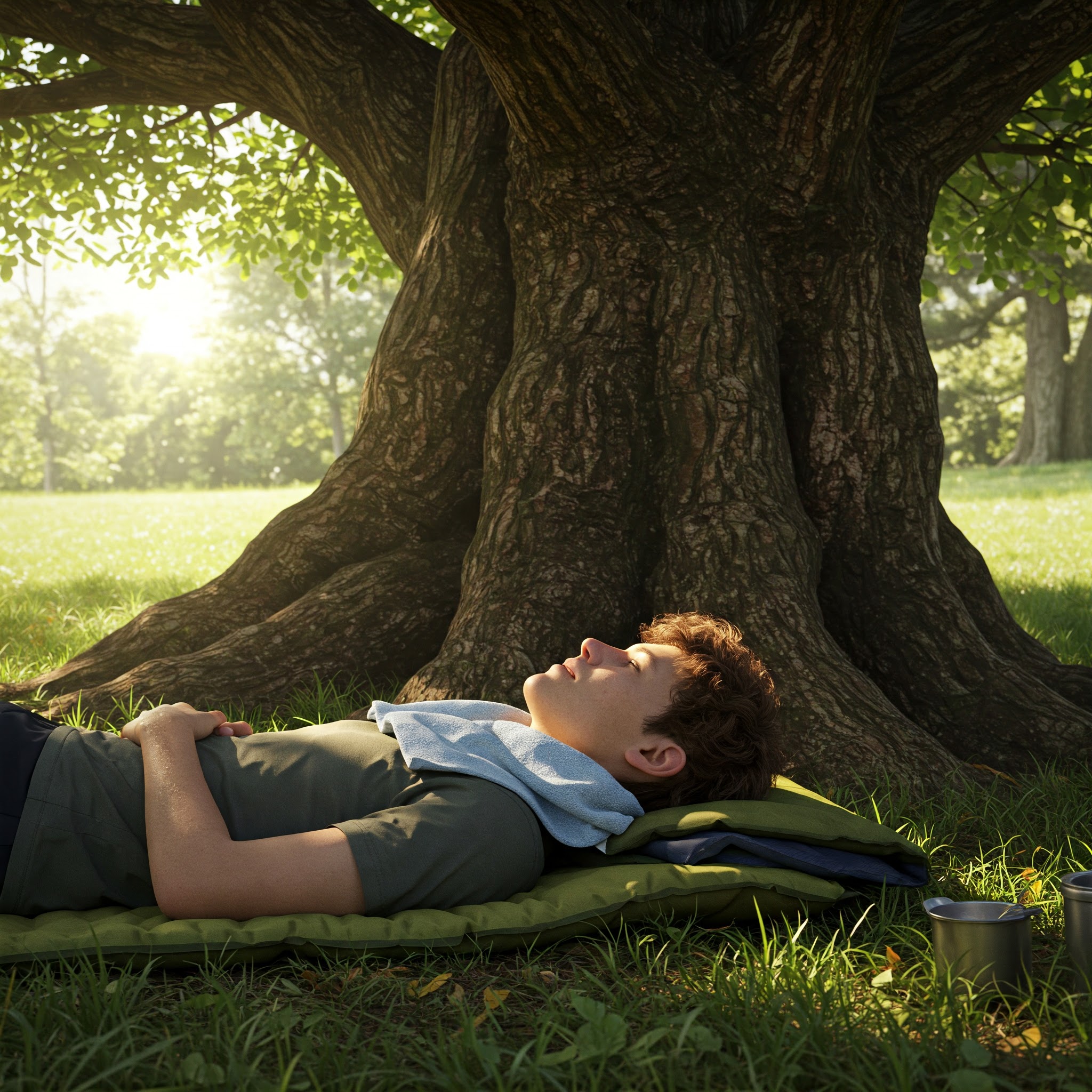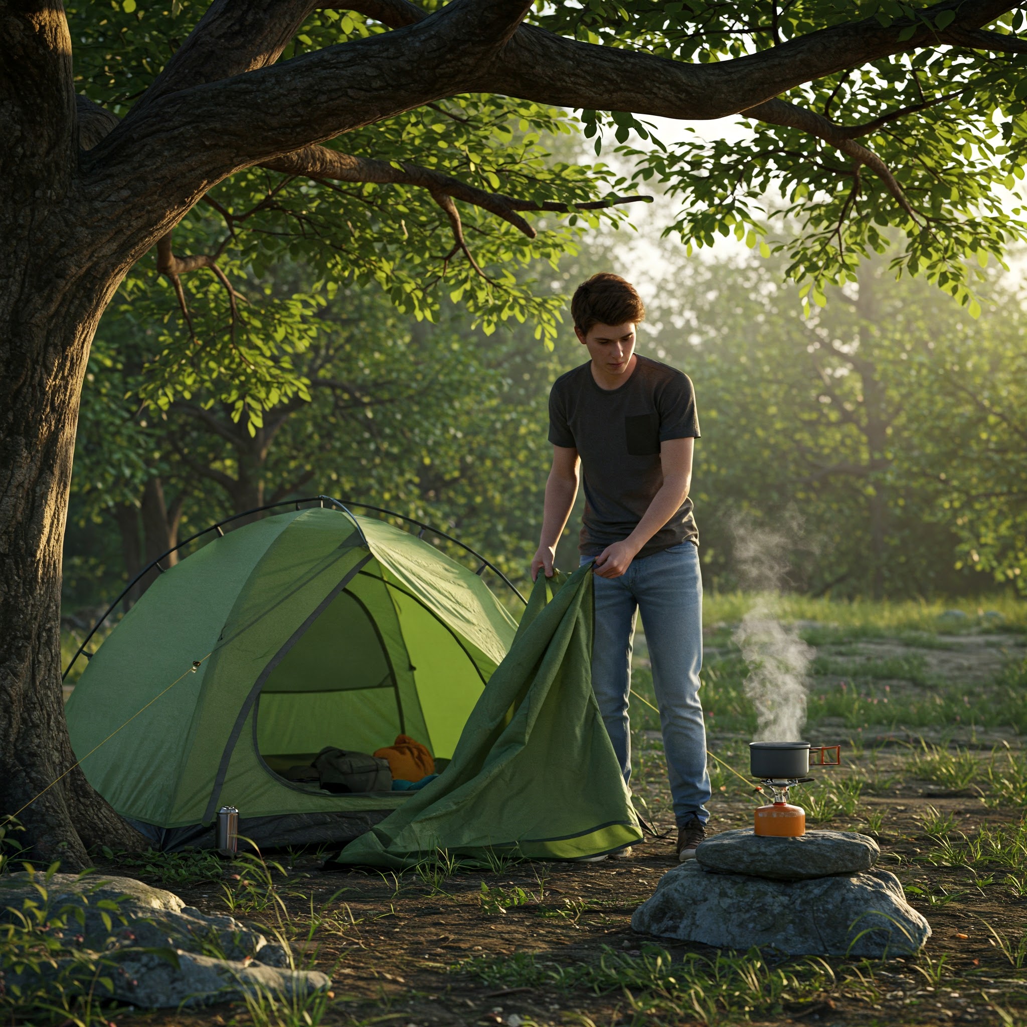 Ağaç Gölgesine Çadır Kurmuş Kampçı (Yapay zeka ile oluşturuldu)