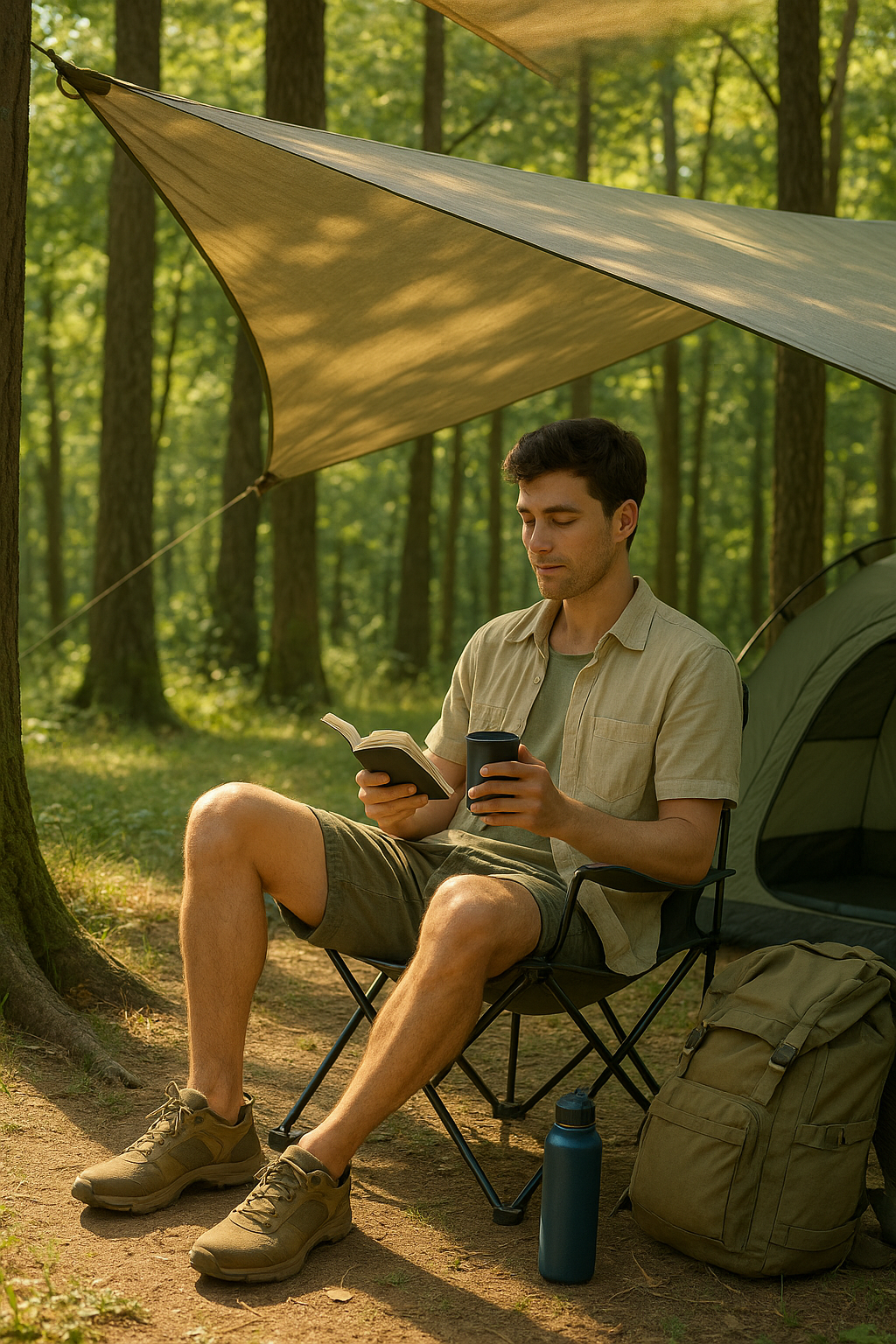 Katlanabilir tarp (branda) veya tente, kamp alanında ek gölgelik oluşturmanın en pratik yoludur. Geçen yaz, yemek hazırladığımız alanın üzerine gergin bir branda astık, hem güneşten korunduk hem de yemekler daha keyifli hale geldi. Bu tarz malzemeleri taşıması kolay olduğu için şahsen her kampta kullanıyorum.
